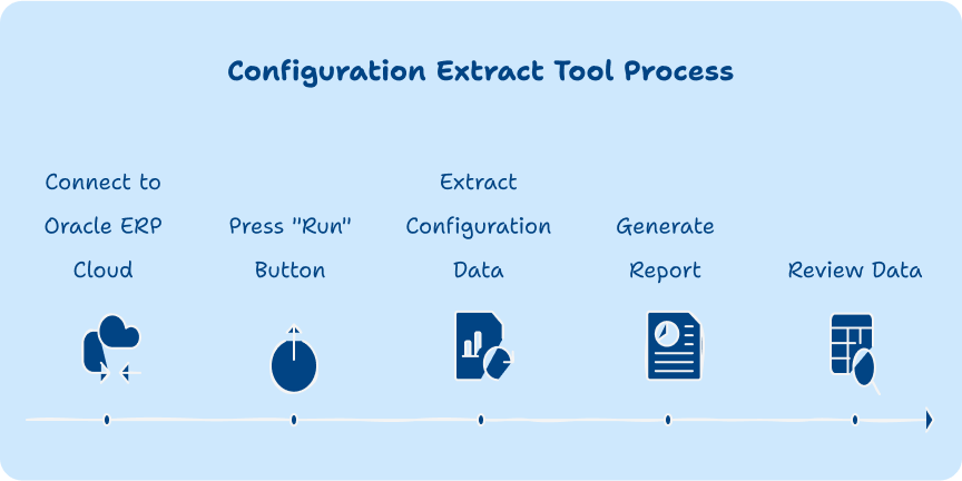 Manually retrieving configuration values from Oracle ERP Cloud can be a time-consuming and complex process. Configuration Extract is here to make your life easier. With our user-friendly tool, you can now extract all configuration data quickly and accurately with just a few clicks—saving you valuable time and ensuring consistency in your ERP setup.