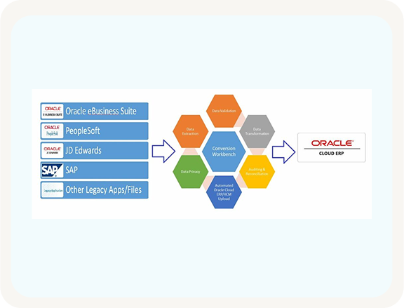 Conversion Workbench supports EBS 12.x and the latest version of Oracle Cloud ERP applicationThe Conversion Workbench supports EBS 12.x and the latest version of Oracle Cloud ERP application.