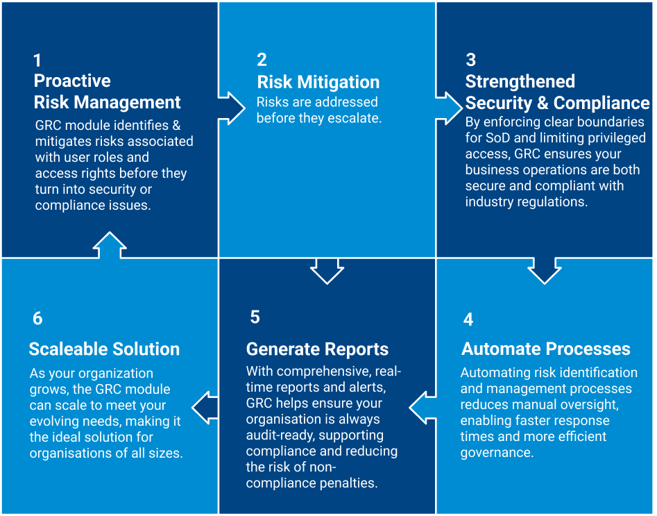 Organisations in regulated industries benefit from GRC by ensuring that user access and permissions align with legal and regulatory requirements such as SOX, GDPR, and others.
